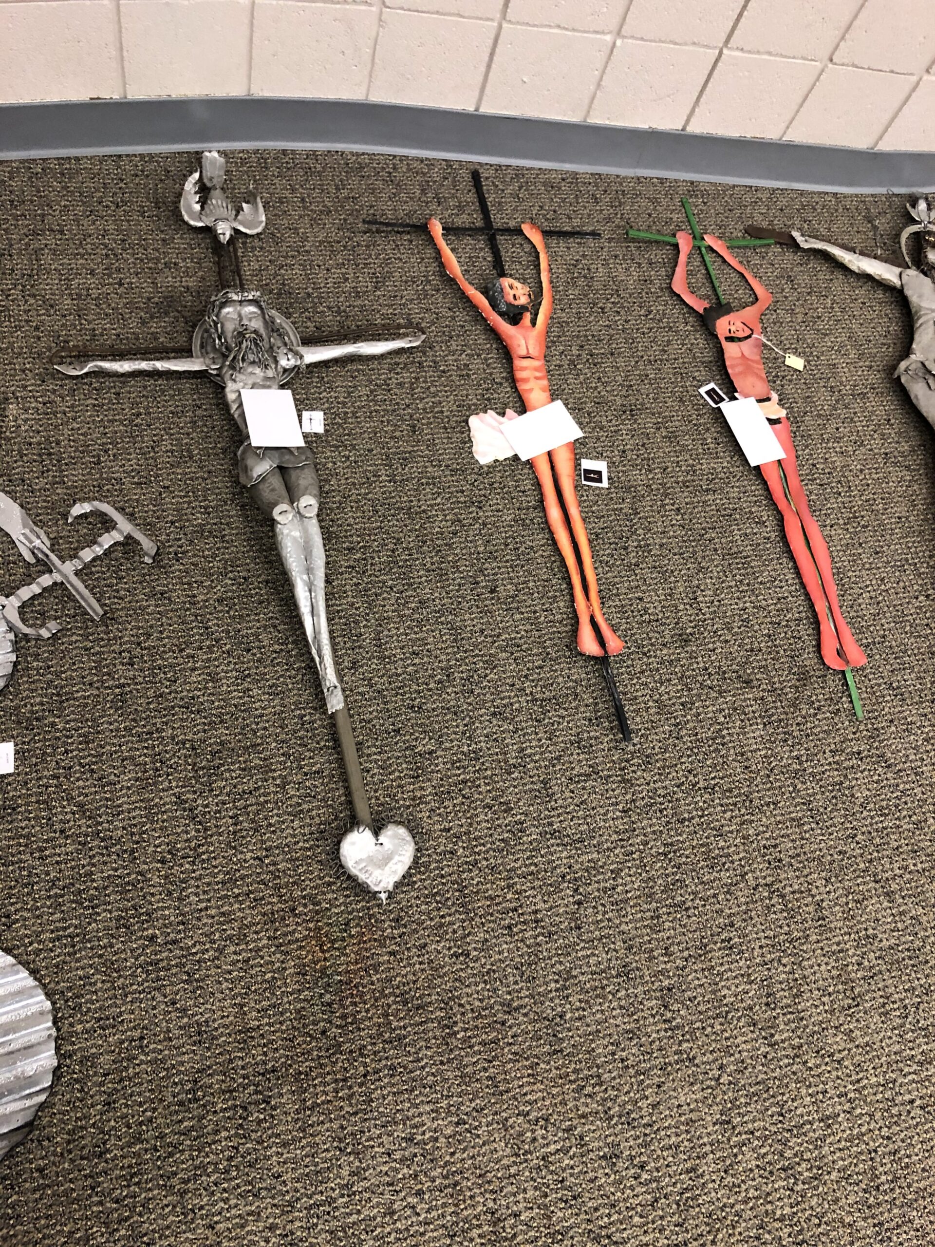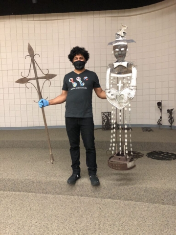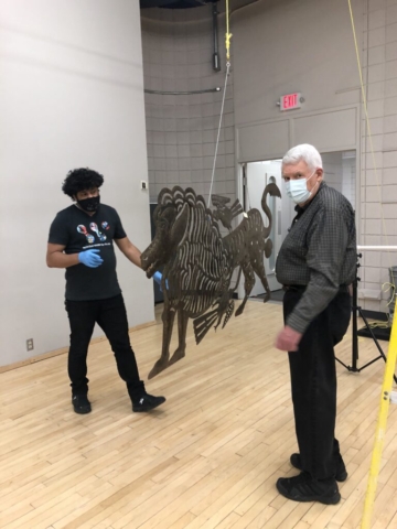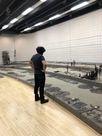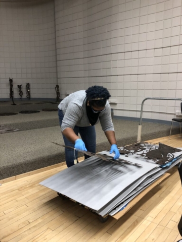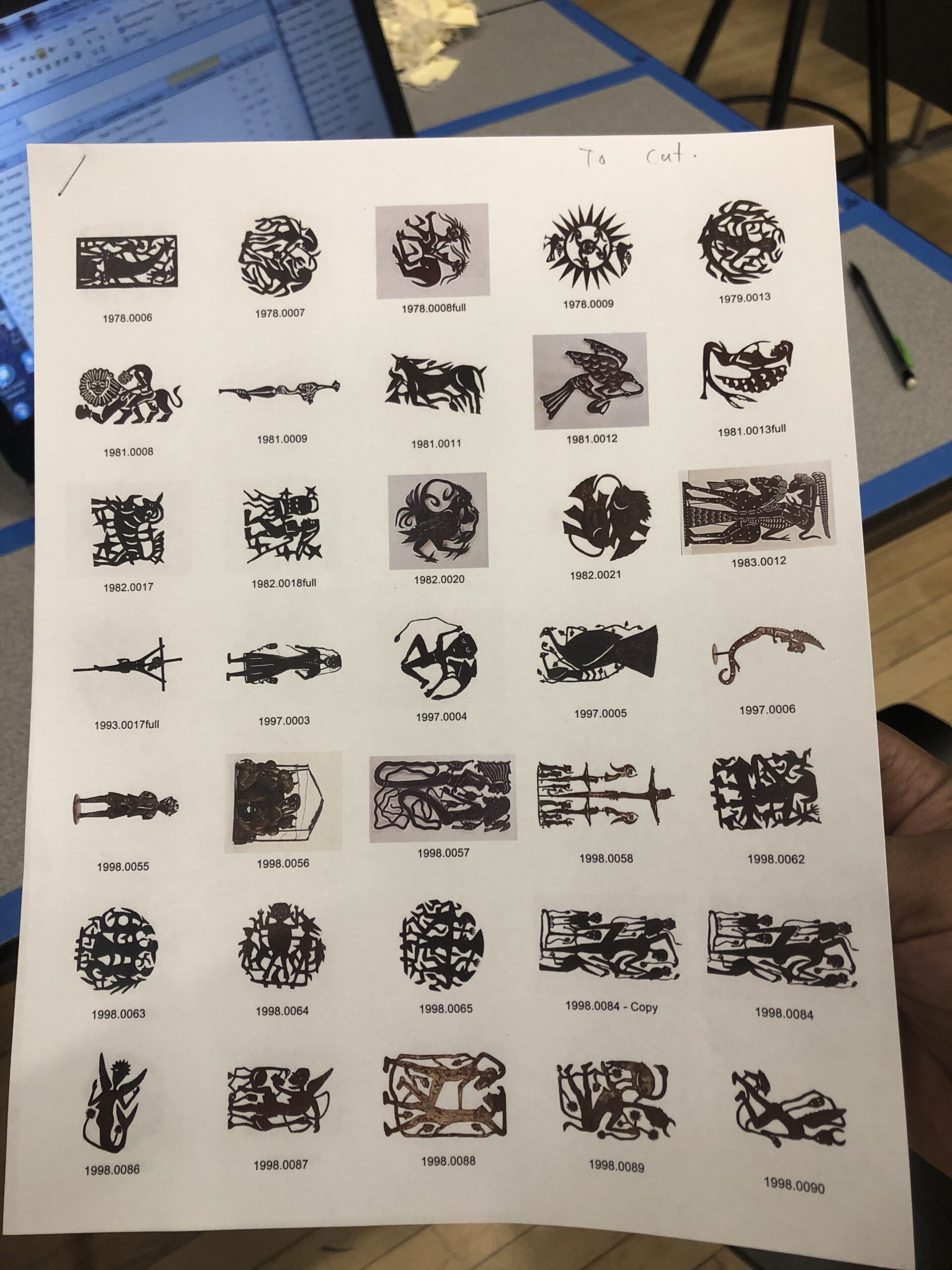 The Waterloo Center for the Arts holds a substantial collection of metalwork. In storage, the pieces hang from pegboard dividers. To digitize such a large number of objects, staff created a visual checklist to ensure each work could be accurately moved from the vault to the work area. That space was split into two zones—one for photography and one for data verification—both operating at the same time. Objects were arranged by size and shape, and each piece was accompanied by a printout showing its image and inventory number. This system helped prevent objects from being misplaced as they moved between stations.