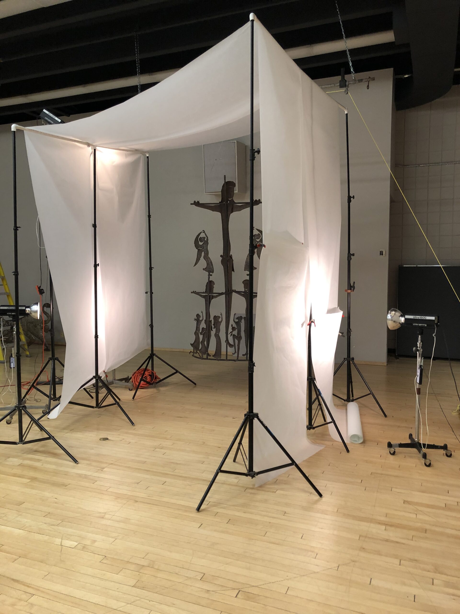 For photographing metalwork, a white box is especially useful because it helps control the reflective glare that often appears on metal surfaces. To suspend the pieces, a harness was built into the box’s design. This setup made it easier to rotate each object so that both its front and back could be photographed clearly.