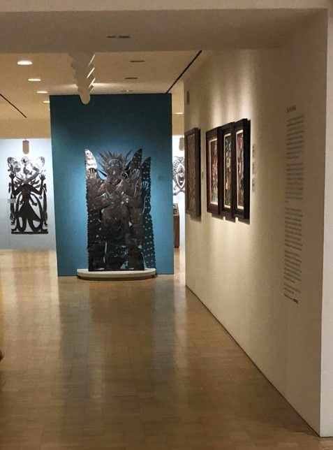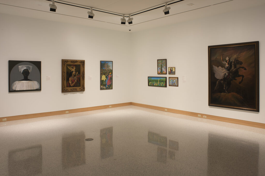 The Art Galleries at Ramapo College of New Jersey maintains the personal collection of Selden Rodman, a founding co-director of the renowned Centre d’Art, founded in 1945 in Port-au-Prince, Haiti. Ramapo’s prominent collection of around 350 artworks provides a rubric for reconsidering and decolonizing narratives of Haitian art and for connecting with the Haitian diaspora and Black communities in the tri-state area. We aim to address significant space and capacity concerns and aid in photographing and digitizing artworks. This photograph displays several artworks displayed at The Art Galleries at Ramapo College of New Jersey. The collection of works we will digitize spans scales and formats, including sculpture, painting, and mixed-media works. Currently, the majority of the Haitian art collection is stored in limited facilities adjacent to the galleries in the Berrie Center for Performing and Visual Arts.