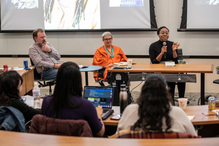 Panelists include Vadricka Etienne (Sociology), Gwenola Caradec (French), Tess Kulstad (Anthropology), Doug Hess (Political Science)